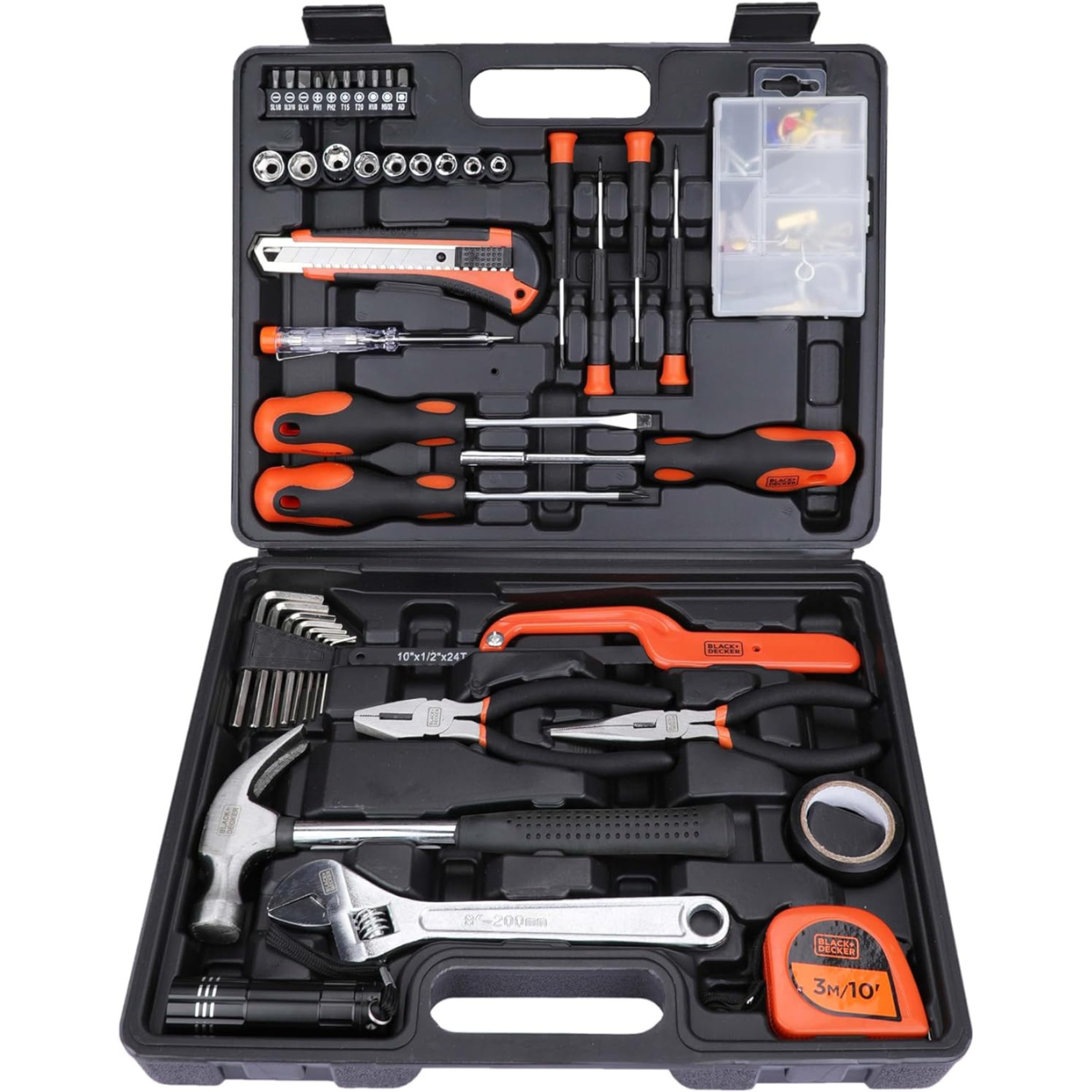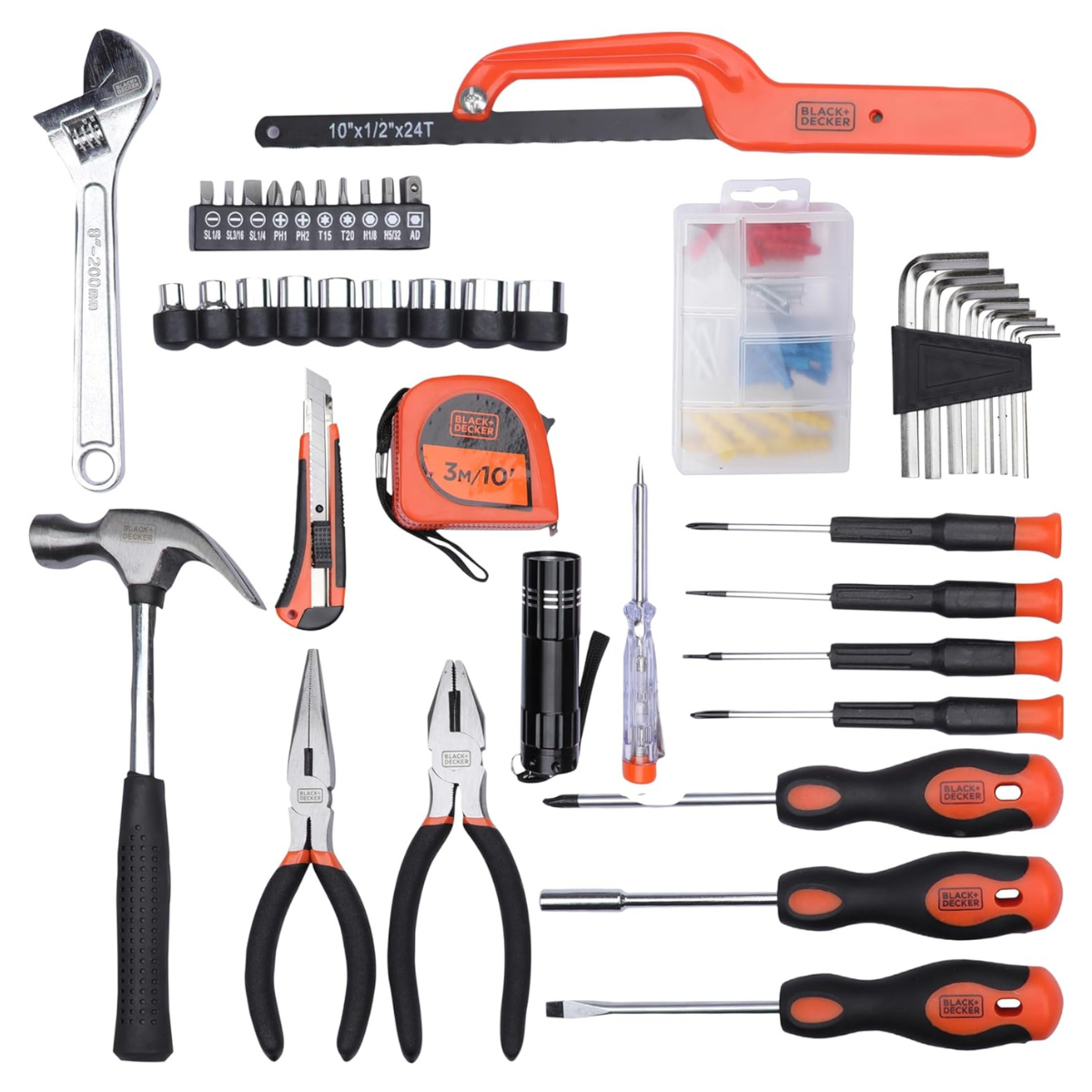 Incluye:• 1 Miniarco de sierra: 10" (254mm)• 10 Set de puntas - fenda 1/8" - fenda 3/16" - fenda 1/4" - PH1, PH2, T15, T20, H1/8", H5/32, adaptador• 1 Linterna Led• 4 Destornilladores de precisión: PH1, PH0 (1.6mm, 2.0mm)• 1 Cinta aislante: 5m,
